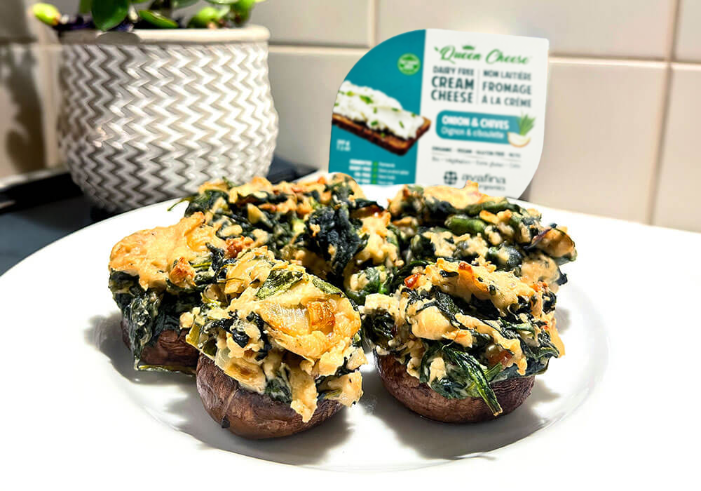 Gourmet mushroom caps stuffed with Queen CheeseTM and spinach.